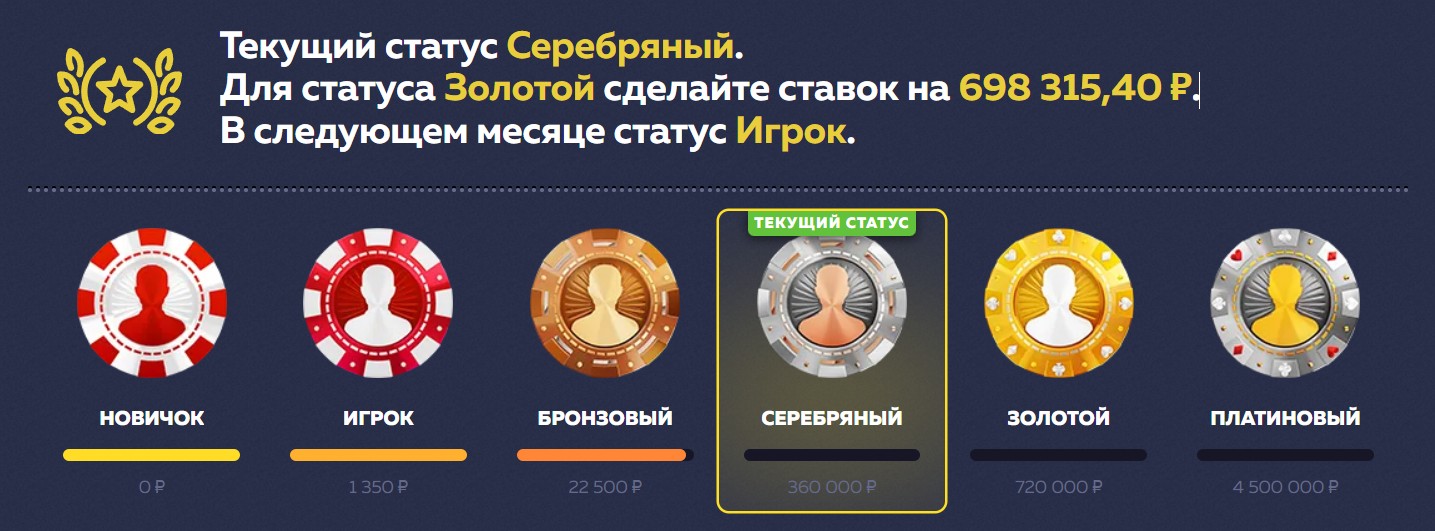 Играя на реальные деньги каждому игроку в казино Вавада присваивается статус. Он автоматически повышается при достижении игроком определенной суммы ставок в слотах и лайв-играх: